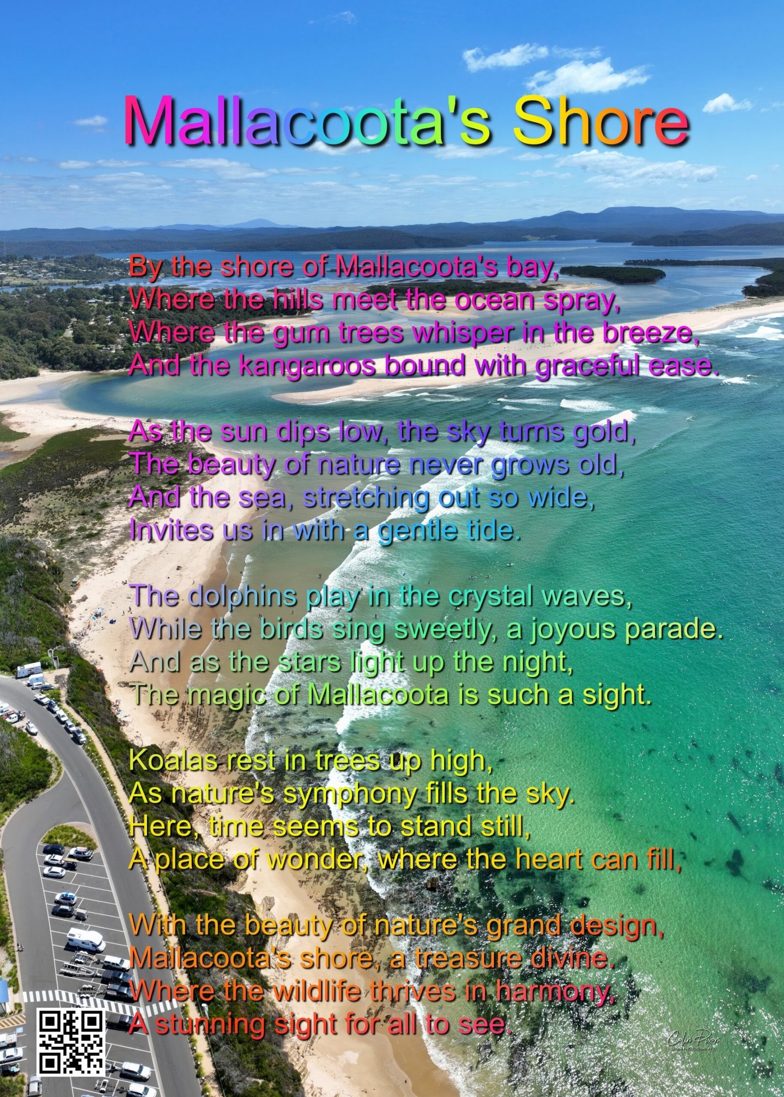 These artworks are then shared with the world, allowing others to experience Mallacoota's beauty as seen from the skies. Each piece is a celebration of the region's natural splendour and an invitation to view the world from a different angle—a reminder of the awe-inspiring beauty that surrounds us, often unnoticed in our everyday lives.